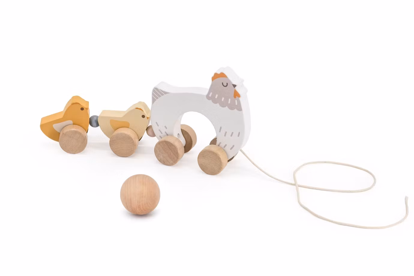Superfestlig draghöna som vobblar, ägget rullar och kycklingarna hänger på.