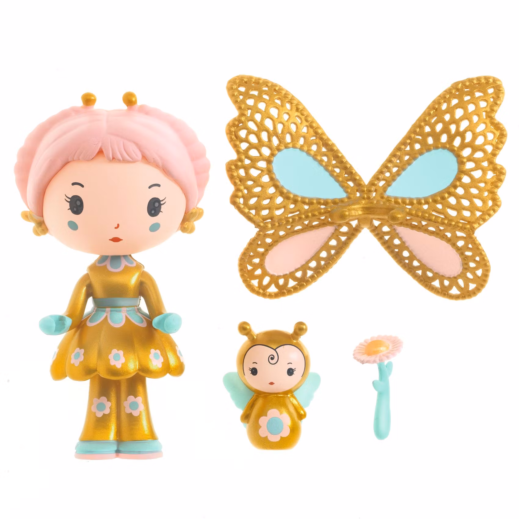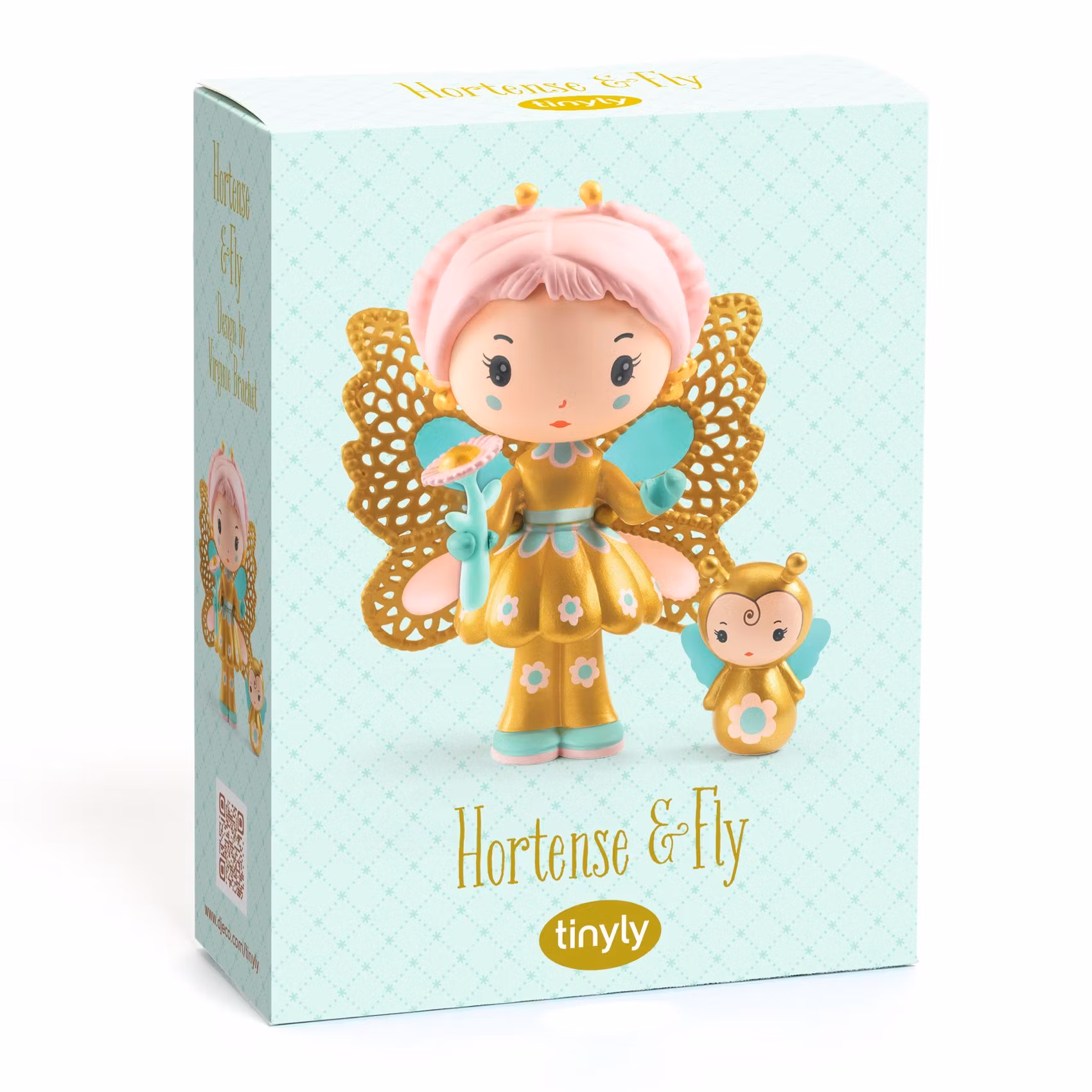 De vackra fjärilsfigurerna Hortense och hennes följeslagare Fly är en fröjd för ögat. Klädda i guld glittrar de som ädelstenar! Hon hon älskar att plocka vackra blommor, har stora, avtagbara vingar och har alltid sin trogna följeslagare Fly vid sin sida – en ung fjärils-älva. Dessa figurer, med sina mjuka färger och fina detaljer, är hämtade från Tinylys magiska värld. De har rörliga huvuden och armar, och är perfekta att samla på, visa upp eller använda som karaktärer i egna spände berättelser och sagolika äventyr. Innehåll: 1 figur, 1 följeslagare och 2 plasttillbehör (blomma och vingar).