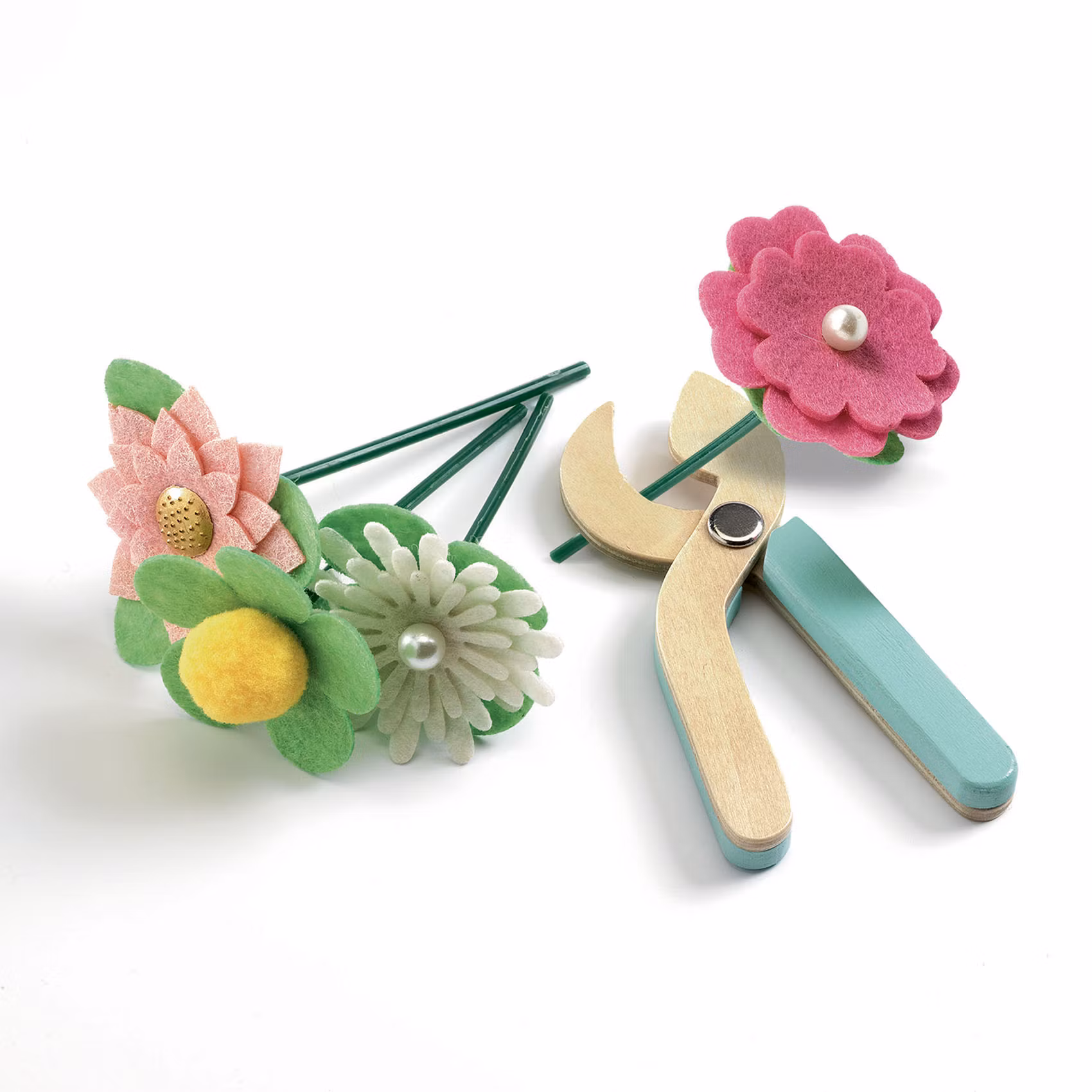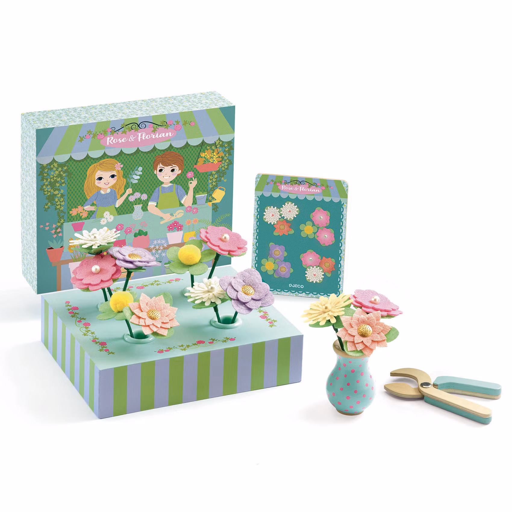 Välkommen till Rose och Florians blomsterbutik! Ett vackert set för att kunna leka blomsterbutik eller florist och sätta ihop buketter enligt beställningar. Den vackra trälådan kan vändas upp och ner och utrustas med fyra hållare där du kan visa upp de färdiga buketterna. Setet innehåller 1 vas i trä, 1 sekatör i trä att låtsas trimma blommorna med, 12 vackra blommor (i filt, trä och plast), 4 hållare för blommor, en meny i trä där kunder kan visa vilken bukett de vill ha samt en snygg och tålig trälåda som rymmer alla delar i setet samt kan vändas för att bilda en disk att visa upp blommorna på.