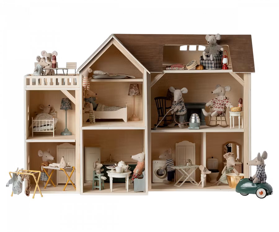 Mushål Bondgård är det perfekta hemmet för din musfamilj. Dekorera varje rum med dina favoritmöbler och tillbehör. Om huset blir för litet kan du lägga till bonusrummet. Huset behöver monteras.