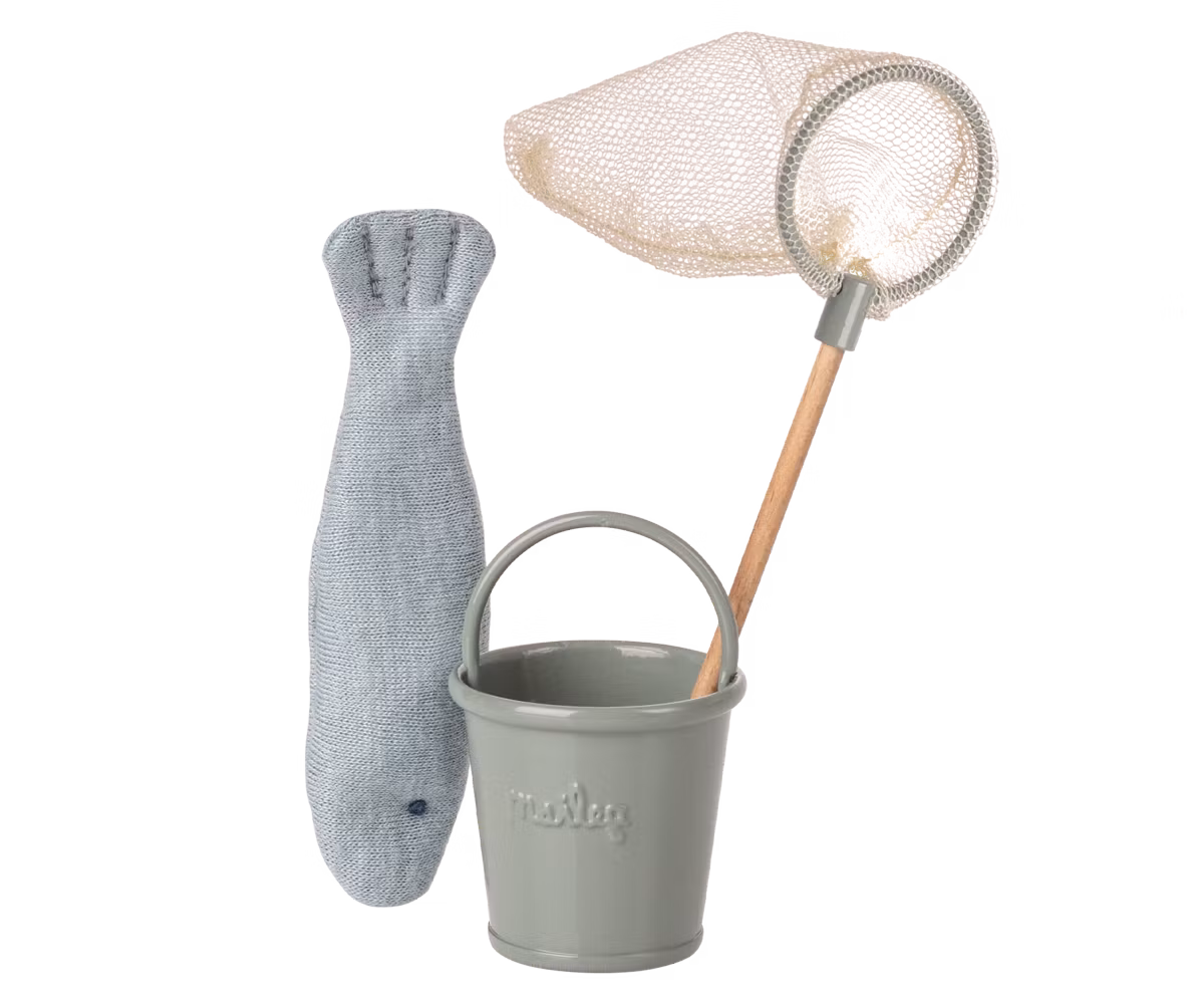 Fiskesetet är ett utmärkt tillbehör för musfamiljen att börja en ny lekstund. Setet inkluderar ett fisknät, fisk och en hink för att ta hem fångsten.