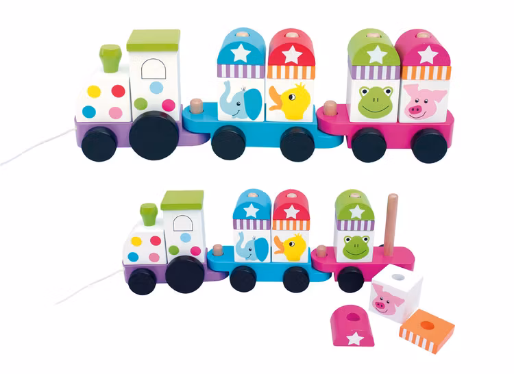 Söt dragleksak i form av ett tåg med stapelbara klossar. Stapla av och på och kör i väg med tåget. Dragleksaken stimulerar barnets lek och barnet lär sig både färg och form samtidigt som koordinationsförmågan tränas upp. Tåget har 3 vagnar som man kan ta av eller sätta ihop. Tillsammans med vagnarna kan barnet stapla på 13 olika klossar i olika färger och mönster. En uppskattad present som garanterat kommer att göra succé.