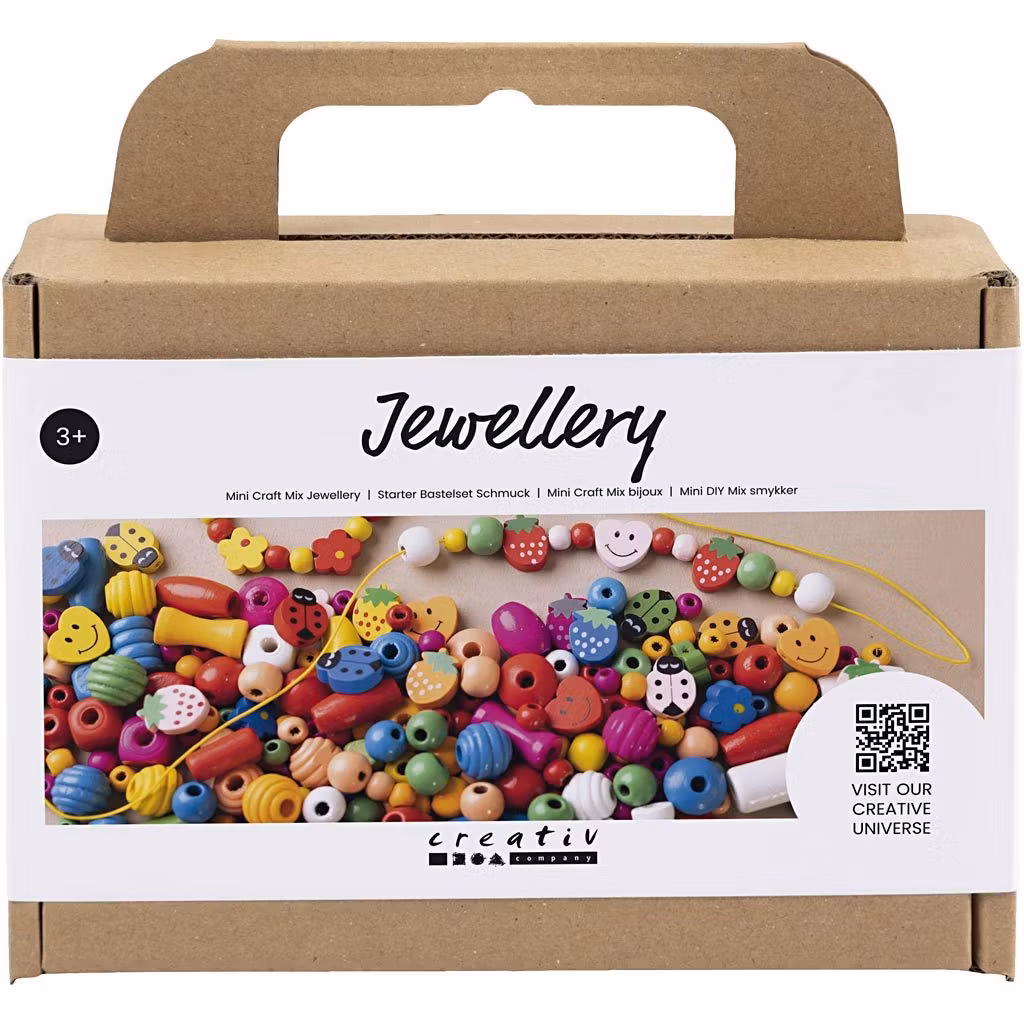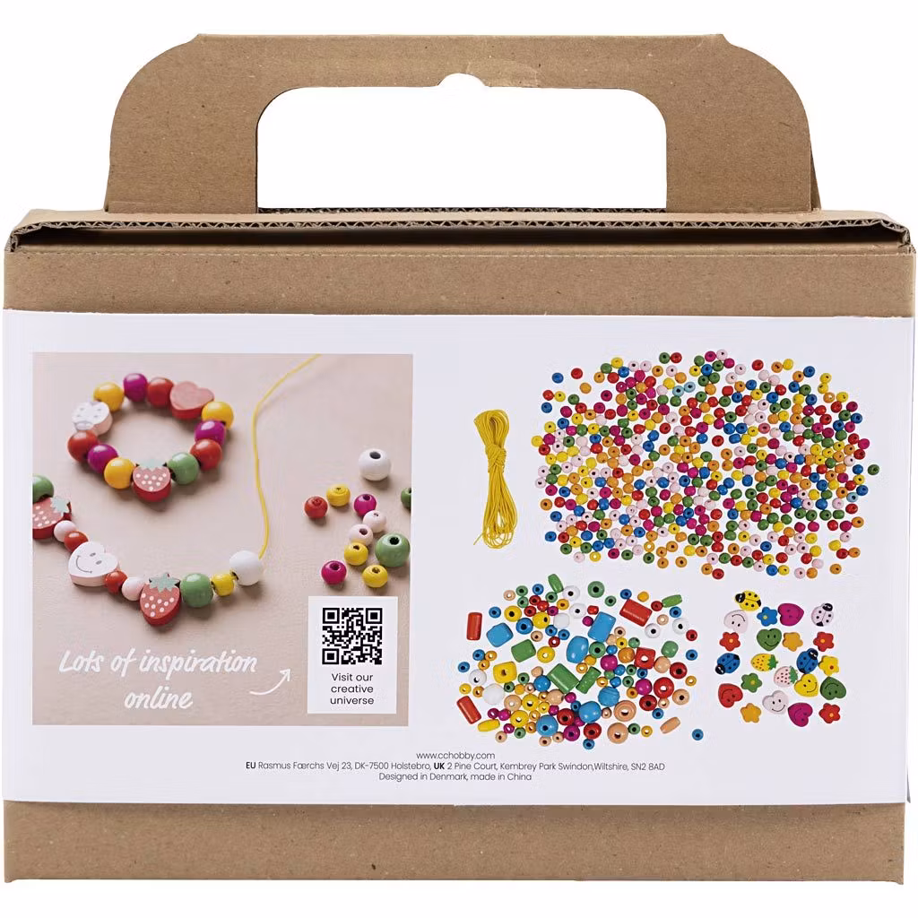 Vill barnen göra egna pärlsmycken i fina färger passar det här lilla pysselsetet perfekt. Det innehåller allt du behöver för att komma igång. Träpärlorna finns i olika storlekar, former och färger – och barnen kan kombinera dem fritt för ett resultat som tilltalar dem. Tips: Använd en trubbig stoppnål för den medföljande gummiresåren så kan du enkelt trä den genom pärlorna.